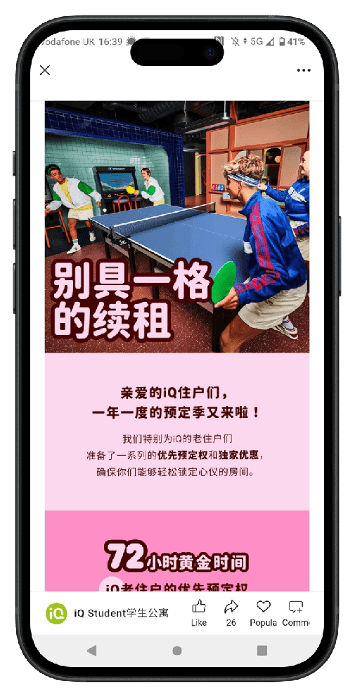 Regular WeChat-hosted surveys in Chinese capture feedback on everything from room preferences to amenities and budgets. As well as boosting re-booking numbers and friend referral schemes, the findings from the surveys inform both marketing and product development, ensuring iQ remains aligned with evolving student expectations.