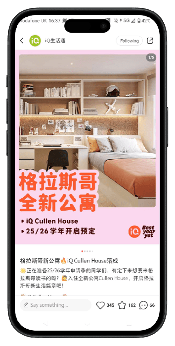 Recognising the power of authentic storytelling, TONG built an “always-on” KOC network that showcases iQ properties across cities and price points. In June 2025, lifestyle creator 赵百万在英国 produced a day-in-the-life video about an iQ property in Leeds, achieving 3 million+ views and 200,000 engagements across RED and Douyin. Her honest review reflected real student experiences – seamlessly highlighting iQ’s unique value proposition.