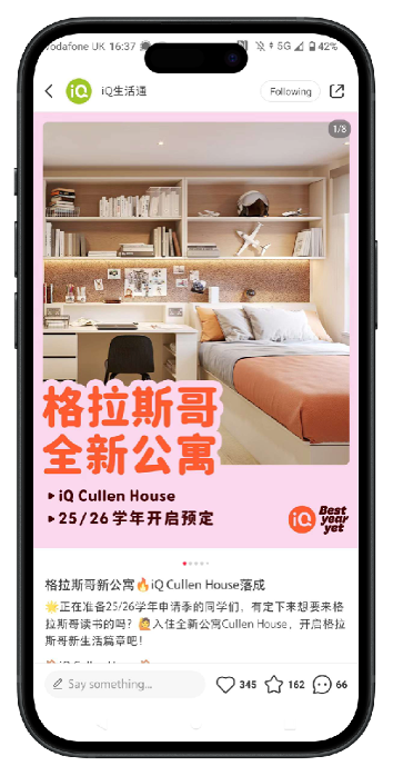 iQ Students is now recognised as one of the most reputable and well-known PBSA providers among Chinese students in the UK. Its brand evokes trust, community, and student well-being – attributes strengthened by TONG’s ongoing local insight and execution.
