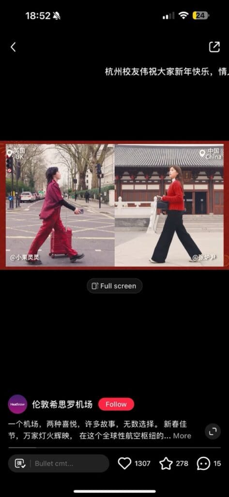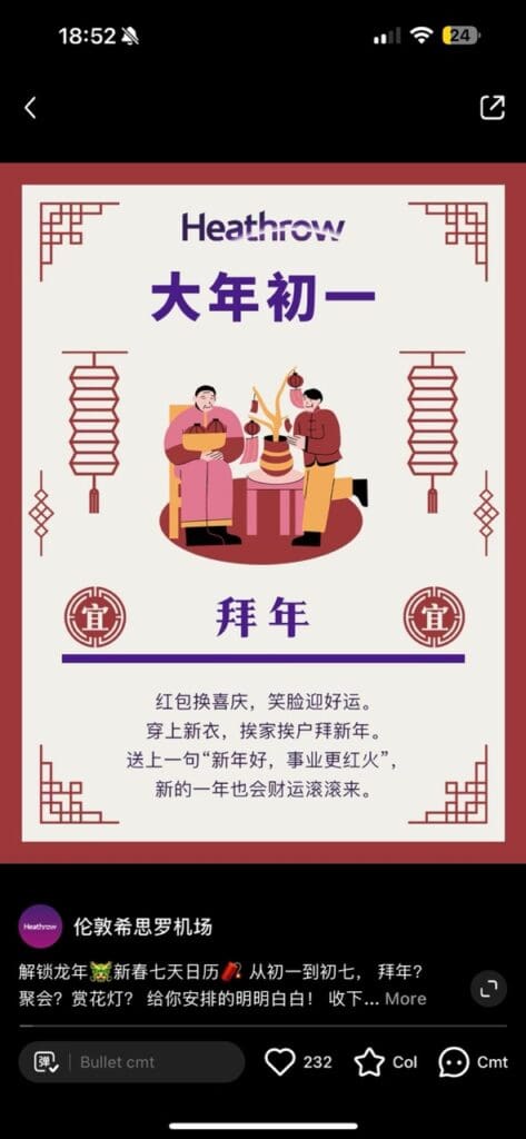 - In contrast, UK-based influencers fuelled anticipation by releasing behind-the-scenes footage and highlights from their filming at Heathrow Airport for the CNY videos. They subtly integrated Heathrow’s services, encouraging viewers to visit our account for the full video.