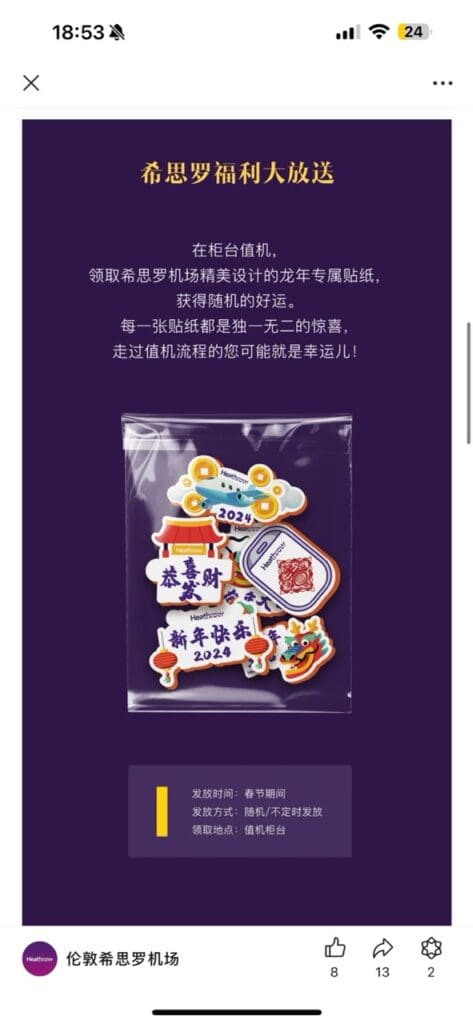 Tailored Heathrow Chinese New Year luggage stickers and red envelope covers, featuring auspicious well wishes, are offered at terminal shops and check-in desks. These well-designed labels and covers provide a shareable gesture for travellers passing through Heathrow Airport. We also created various CNY-themed greeting posters to wish all Chinese travellers a Happy Chinese New Year.