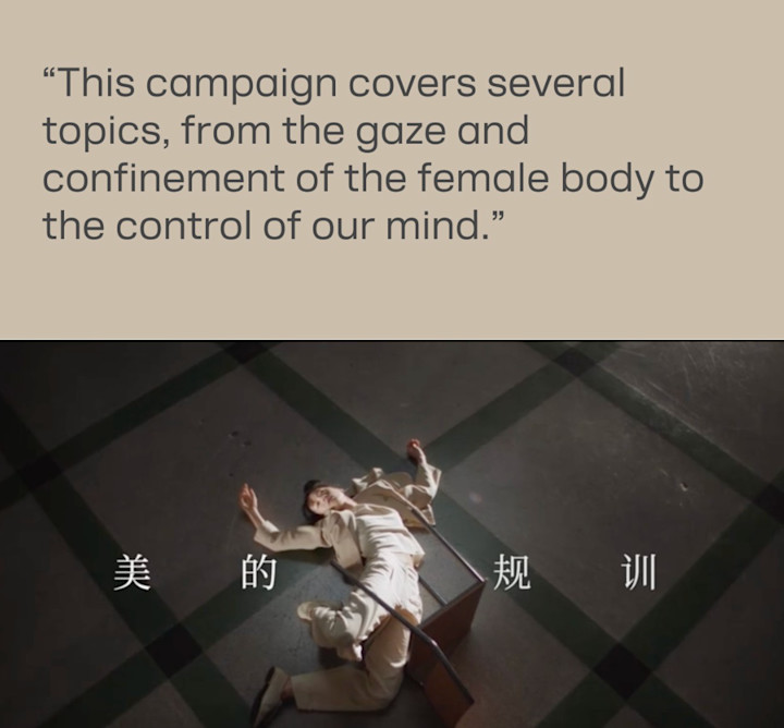 “This campaign covers several topics, from the gaze and confinement of the female body to the control of our mind, from being honest with oneself to women openly discussing sex, from PUA and the violence suffered by women, all of which are realised through the medium of the body. The campaign also presents these themes in the form of modern dance, allowing us to confront these pains and dilemmas more visually and directly.