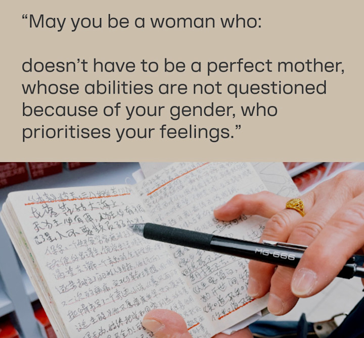 “May you be a woman who doesn’t have to be a perfect mom.” “May you become a woman who is not afraid of gynaecological examinations.” “May you become a woman whose abilities are not questioned because of your gender.” “May you be a woman who prioritises your feelings.”